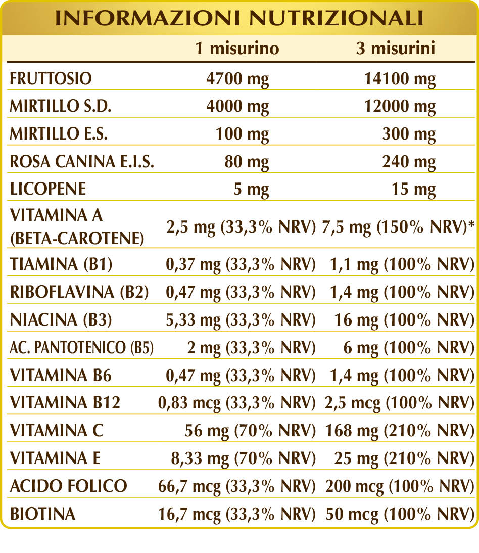 Fructosa, arándano negro (Vaccinium myrtillus) frutos J.D., maltodextrinas de maíz o arroz, arándano negro (Vaccinium myrtillus) frutos E.S. (estandarizado al 25 % en antocianinas), rosal silvestre (Rosa canina) frutos E.S. (estandarizado al 70 % en vitamina C), tomatera (Solanum lycopersicum) frutos E.S. (estandarizado al 10% en licopeno), beta-caroteno (estandarizado al 10Â %), vitamina E (acetato de DL-α-tocoferilo), vitamina B3 (nicotinamida), vitamina B5 (pantotenato de calcio), vitamina B2 activada (riboflavina 5-fosfato de sodio), vitamina B6 activada (piridoxal-5-fosfato), vitamina B1 (clorhidrato de tiamina), ácido fólico activado (L-metilfolato de calcio), biotina, vitamina B12 activada (5-desoxiadenosilcobalamina, metilcobalamina)..
