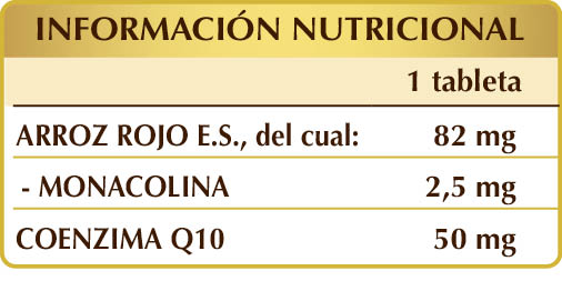 Arroz rojo fermentado (Oryza sativa fermentada con levadura Monascus purpureus) semillas E.S. (titulado al 3 % en monacolina K), coenzima Q10, maltodextrinas de maíz o arroz, celulosa microcristalina°, goma arábiga°, dióxido de silicio°°, estearato de magnesio de origen vegetal°°. °Agente de carga. °°Antiaglomerante.