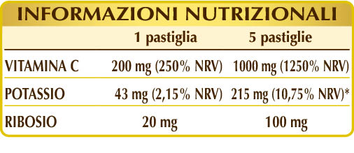 Complemento alimenticio a base de ascorbato potásico, forma alcalina y no ácida de la vitamina C, enriquecido con ribosa. La vitamina C posee múltiples propiedades: favorece el metabolismo energético, reduciendo el cansancio y la fatiga; protege las células contra el estrés oxidativo y regenera la forma reducida de la vitamina E; contribuye al buen funcionamiento del sistema inmunitario, del sistema nervioso y de la función psicológica; estimula la formación del colágeno, ayudando a mantener la buena salud de los vasos sanguíneos, los huesos, los cartílagos, la piel, los dientes y las encías; aumenta la absorción del hierro.
