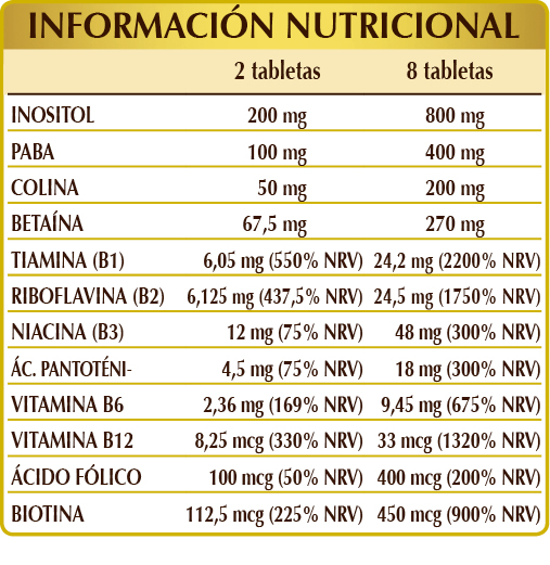 Complemento alimenticio que contiene todas las vitaminas del grupo B. En particular, las vitaminas B6 y B12 favorecen la formación normal de los glóbulos rojos y, junto a las vitaminas B2, B3 y B5 y al ácido fólico, reducen el cansancio y la fatiga. Las vitaminas B1, B3, B6 y B12 y la biotina contribuyen al correcto funcionamiento del sistema nervioso y, junto al ácido fólico, son útiles para mantener una correcta función psicológica. Las vitaminas B6 y B12 y el ácido fólico también son indispensables para el buen funcionamiento del sistema inmunitario.