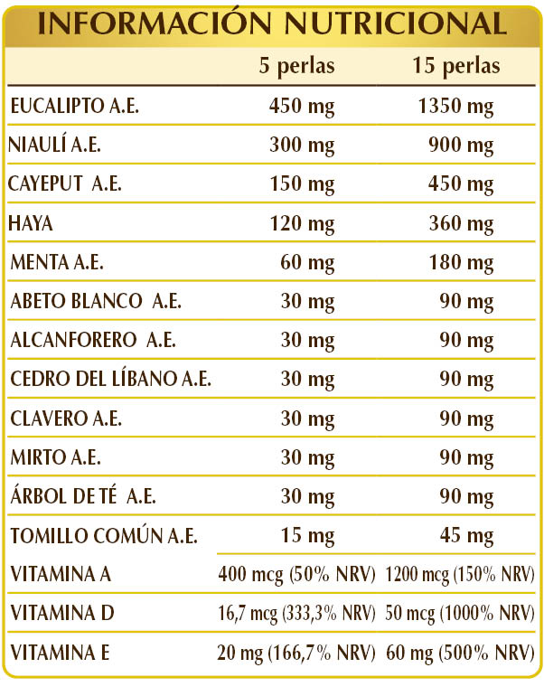 Germen de trigo (Triticum aestivum) aceite, eucalipto (Eucalyptus globulus) hojas A.E., niaulí (Melaleuca leucadendron var. viridiflora) hojas A.E., cayeput (Melaleuca leucadendron var. cajaputi) hojas A.E., haya (Fagus sylvatica) brea (pix), abeto blanco (Abies alba) agujas y yemas A.E., alcanforero (Cinnamomum camphora) cortezas A.E., cedro del Líbano (Cedrus libani) madera A.E., clavero (Eugenia caryophyllata) yemas florales A.E., hierbabuena (Mentha spicata) hojas A.E., menta silvestre (Mentha arvensis) hojas A.E., mirto (Myrtus communis) hojas A.E., árbol de té (Melaleuca alternifolia) hojas A.E., tomillo común (Thymus vulgaris) hojas A.E.; vitamina A (palmitato de retinilo), vitamina D3 (colecalciferol); excipientes (cápsula blanda): gelatina alimentaria y glicerina.