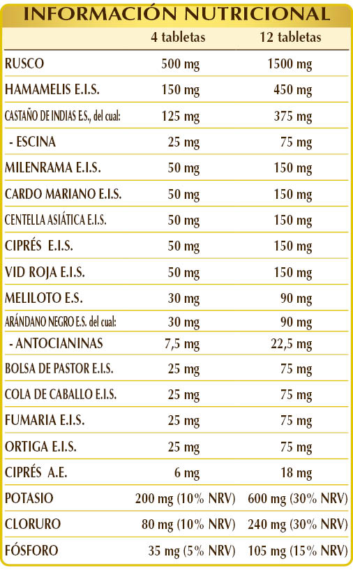 Rusco (Ruscus aculeatus) raíces polvo, fosfato potásico dibásico, cloruro de potasio, hamamelis (Hamamelis virginiana) hojas E.I.S., celulosa microcristalina°, goma arábiga°, castaño de Indias (Aesculus hippocastanum) semillas E.S. (estandarizado al 20 % en escina), citrato de potasio, milenrama (Achillea millefolium) hierba con flores E.I.S., cardo mariano (Silybum marianum) frutos E.I.S., centella asiática (Centella asiatica) hierba E.I.S., ciprés (Cupressus sempervirens) gálbulos (frutos) E.I.S., vid roja (Vitis vinifera) hojas E.I.S., meliloto (Melilotus officinalis) hierba con flores E.S. (estandarizado al 20 % en cumarina), arándano negro (Vaccinium myrtillus) frutos E.S. (estandarizado al 25 % en antocianinas), bolsa de pastor (Capsella bursa-pastoris) hierba E.I.S., cola de caballo (Equisetum arvense) hierba E.I.S., fumaria (Fumaria officinalis) hierba con flores E.I.S., ortiga (Urtica dioica) hojas E.I.S., dióxido de silicio°°, ciprés (Cupressus sempervirens) hojas y ramitas A.E., estearato de magnesio de origen vegetal°°.