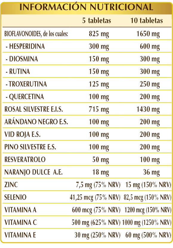 Rosal silvestre (Rosa canina) frutos E.I.S. (titulado al 70% en vitamina C), hesperidina procedente de cítricos, celulosa microcristalina°, goma arábiga°, diosmina procedente de cítricos, rutina, troxerutina, quercetina, arándano negro (Vaccinium myrtillus) frutos E.S. (titulado al 25 % en antocianinas), pino silvestre (Pinus sylvestris) cortezas E.S. (titulado al 95 % en proantocianidinas oligoméricas), vid roja (Vitis vinifera) semillas E.S. (titulado al 95 % en proantocianidinas oligoméricas), vitamina E de origen vegetal (acetato de D-α-tocoferol), resveratrol de origen vegetal, dióxido de silicio°°, naranjo dulce (Citrus aurantium var. sinensis o dulcis) cáscaras de los frutos A.E., estearato de magnesio de origen vegetal°°, vitamina A (acetato de retinilo), selenito de sodio. °Agente de carga °°Antiaglomerante