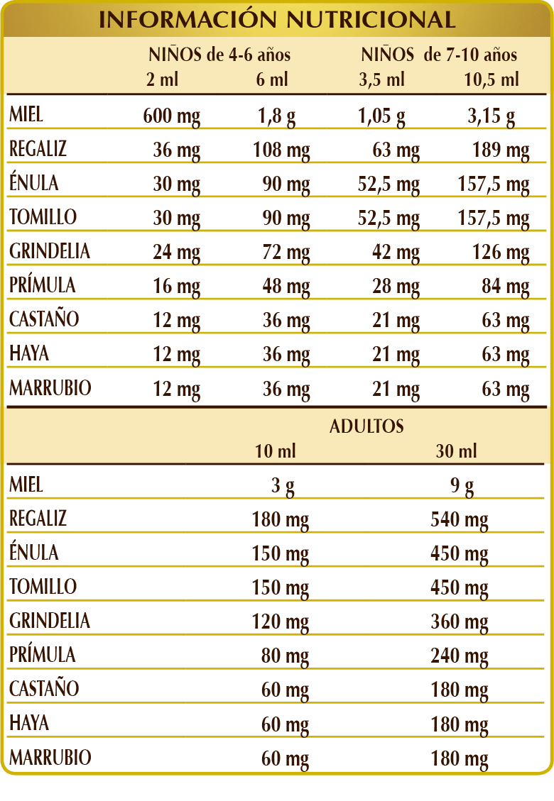 Glicerina vegetal bidestilada, miel milflores, agua pura, cloruro de calcio, regaliz (Glycyrrhiza glabra) raíces E.I.L., énula (Inula helenium) raíces E.I.L., tomillo común (Thymus vulgaris) hojas E.I.L., grindelia (Grindelia robusta) hierba con flores E.I.L., prímula (Primula officinalis) raíces E.I.L., castaño (Castanea vesca o sativa) hojas E.I.L., haya (Fagus sylvatica) brea (pix) E.I.L., marrubio (Marrubium vulgare) hierba con flores E.I.L.; edulcorantes de origen natural: glucósidos de esteviol, taumatina.