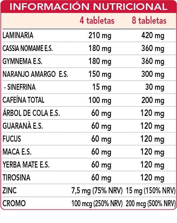 Laminaria (Laminaria digitata) talo (alga) polvo, cassia nomame (Cassia mimosoides var. nomame makino) hojas E.S. (titulado al 8 % en dímeros flavánicos), gymnema (Gymnema sylvestre) hojas E.S. (titulado al 75 % en ácido gimnémico), celulosa microcristalina°, goma arábiga°, naranjo amargo (Citrus aurantium var. amara) cáscaras de los frutos inmaduros E.S. (titulado al 10 % en sinefrina), árbol de cola (Cola acuminata) semillas E.S. (titulado al 10 % en cafeína), fucus o sargazo vejigoso (Fucus vesiculosus) talo (alga) polvo, guaraná (Paullinia cupana) semillas E.S. (titulado al 50 % en cafeína), (L-)tirosina, maca (Lepidium meyenii) raíces E.S. (titulado al 2,5 % en beta-sitosteroles), mate (Ilex paraguariensis) hojas E.S. (titulado al 8 % en cafeína), cafeína, gluconato de zinc, maltodextrinas de maíz o arroz, dióxido de silicio°°, estearato de magnesio de origen vegetal°°, picolinato de cromo. °Agente de carga °°Antiaglomerante