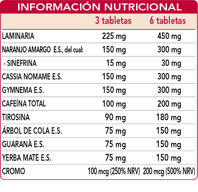 Celulosa microcristalina°, polvo de talo (alga) de laminaria (Laminaria digitata), cáscara de frutos inmaduros de naranja amarga (Citrus aurantium var. amara) E.S. (estandarizado al 10% en sinefrina), cassia nomame (Cassia mimosoides var. nomame makino) hojas E.S. (estandarizado al 8 % en dímeros flavánicos), gymnema (Gymnema sylvestre) hojas E.S. (estandarizado al 75 % en ácido gimnémico), goma arábiga°, (L-)tirosina, árbol de cola (Cola acuminata) semillas E.S. (estandarizado al 10 % en cafeína), guaraná (Paullinia cupana) semillas E.S. (estandarizado al 50 % en cafeína), yerba mate (Ilex paraguariensis) hojas E.S. (estandarizado al 8 % en cafeína), dióxido de silicio°°, cafeína, estearato de magnesio de origen vegetal°°, picolinato de cromo.