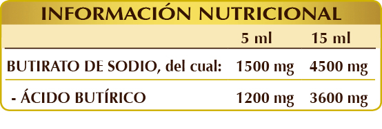 Complemento alimenticio de butirato de sodio, fuente de ácido butírico.
