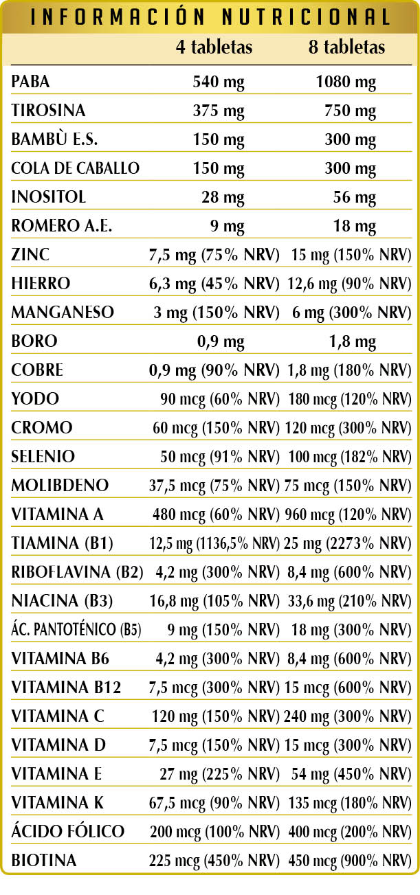 PABA (ácido p-aminobenzoico), (L-)tirosina, celulosa microcristalina°, goma arábiga°, bambú (Bambusa vulgaris) tallos jóvenes E.S. (titolato al 70% en sílice), cola de caballo (Equisetum arvense) polvo de hierba, vitamina C (ácido ascórbico), gluconato de zinc, vitamina E de origen vegetal (acetato de D-α-tocoferilo), gluconato de hierro, dióxido de silicio°°, mio-inositol de origen vegetal (extracto de maíz), gluconato de manganeso, vitamina B3 (nicotinamida), vitamina B1 (clorhidrato de tiamina), estearato de magnesio de origen vegetal°°, vitamina B5 (pantotenato de calcio), romero (Rosmarinus officinalis) extremidades floridas A.E., borato de sodio, vitamina B2 activada (riboflavina 5-fosfato sódico), vitamina B6 activada (piridoxal-5-fosfato), gluconato de cobre, vitamina A (acetato de retinilo), liquen (Cladonia rangiferina) tallo E.S. (titulado en vitamina D3 colecalciferol 100.000 UI/g), picolinato de cromo, biotina, ácido fólico activado (L-metilfolato de calcio), yoduro de potasio, selenito de sodio, molibdato de sodio, vitamina K1 (filoquinona), vitamina B12 activada (metilcobalamina, 5-deoxiadenosilcobalamina).
