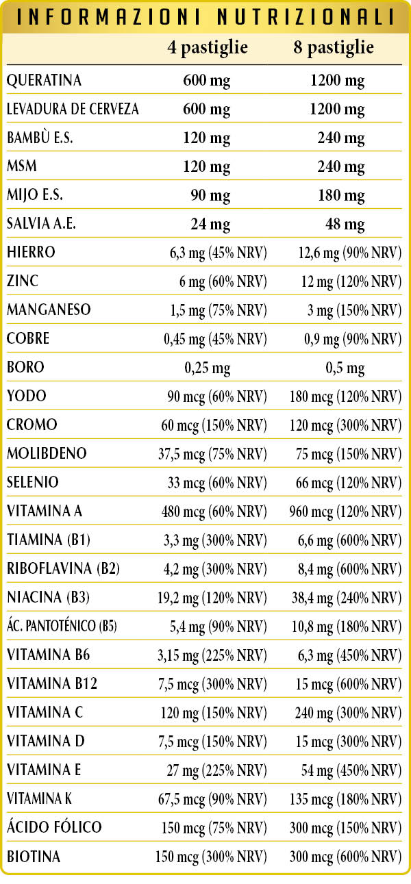Queratina hidrolizada, levadura de cerveza (Saccharomyces cerevisiae), celulosa microcristalina°, goma arábiga°, bambú (Bambusa vulgaris) jóvenes cañas E.S. (estandarizado al 70 % en silicio), MSM (metilsulfonilmetano), vitamina C (ácido ascórbico), mijo (Panicum miliaceum) frutos E.S., vitamina E de origen vegetal (acetato de D-α-tocoferol), gluconato de hierro, gluconato de zinc, dióxido de silicio°°, salvia (Salvia officinalis) hojas A.E., vitamina B3 (nicotinamida), gluconato de manganeso, estearato de magnesio de origen vegetal°°, borato de sodio, vitamina B2 (pantotenato de calcio), vitamina B2 activada (riboflavina 5-fosfato de sodio), vitamina B5 (pantotenato de calcio), vitamina B6 activada (piridoxal-5-fosfato), vitamina B1 (tiamina clorhidrato), gluconato de cobre, vitamina A (acetato de retinilo)., liquen de los renos (Cladonia rangiferina) talo E.S. (estandarizado en vitamina D3 colecalciferol 100 000 UI/g), cromo picolinato, ácido fólico activado (L-metilfolato de calcio), biotina, yoduro de potasio, molibdato de sodio, selenito de sodio, vitamina K1 (filoquinona), vitamina B12 (5-desoxiadenosilcobalamina, metilcobalamina). °Agente de carga. °°Antiaglomerante