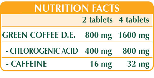 Café (Coffea arabica) semillas verdes (no tostadas) E.S. (estandarizado al 50 % en ácido clorogénico y al 2 % en cafeína), celulosa microcristalina°, goma arábiga°, dióxido de silicio°°, estearato de magnesio de origen vegetal°°.
