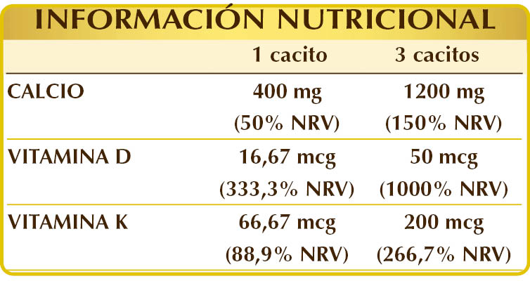 Complemento alimenticio rico en calcio y vitaminas D y K. El calcio contribuye a la correcta neurotransmisión, a la adecuada coagulación de la sangre y al metabolismo energético y, junto a las vitaminas D y K, ayuda a mantener la buena salud de los huesos. La vitamina D promueve la absorción y el uso del calcio y el fósforo y es útil para el funcionamiento normal del sistema inmunitario; por último, junto al calcio, contribuye a una adecuada función muscular e interviene en el proceso de división celular.