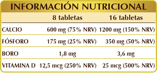 Complemento alimenticio rico en calcio, con fósforo, boro y vitamina D. La vitamina D favorece la absorción y el uso del calcio y del fósforo que, junto a ella, contribuyen a mantener unos huesos y dientes sanos. El calcio puede ser útil para reducir la pérdida de mineral óseo en las mujeres postmenopáusicas, de los 50 años en adelante, en las que una escasa densidad mineral ósea constituye un factor de riesgo para las fracturas osteoporóticas*. Además, el calcio y la vitamina D ayudan a mantener una adecuada función muscular e intervienen en los procesos de división celular. Por último, el calcio favorece una neurotransmisión y una coagulación de la sangre normales y, junto al fósforo, es parte fundamental del metabolismo energético.