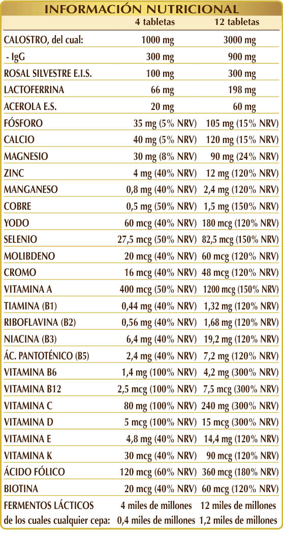 Calostro (estandarizado al 30 % en inmunoglobulinas IgG) procedente de leche de vaca, celulosa microcristalina°, goma arábiga°, fosfato cálcico dibásico, rosal silvestre (Rosa canina) frutos E.S. (estandarizado al 70 % en vitamina C), lactoferrina procedente de leche de vaca, glicerofosfato de magnesio, óxido de magnesio, dióxido de silicio°°, gluconato de zinc, acerola (Malpighia glabra) frutos E.S. (estandarizado al 50% en vitamina C), mezcla de fermentos lácticos (titulada al 10 % en cada una de las siguientes cepas: Bifidobacterium bifidum SD5215, breve SD5206, lactis SD5219; Lactobacillus acidophilus SD5212, brevis SD5214, bulgaricus SD5589, casei SD5213, paracasei SD5275, plantarum SD5209, rhamnosus SD5217), vitamina E de origen vegetal (acetato de D-α-tocoferol), estearato de magnesio de origen vegetal°°, gluconato de manganeso, vitamina B3 (nicotinamida), vitamina A (acetato de retinol), vitamina B5 (pantotenato de calcio), vitamina B6 activada (piridoxal-5-fosfato), liquen de los renos (Cladonia rangiferina) talo E.S. (estandarizado en vitamina D3 colecalciferol 100 000 UI/g), sulfato de cobre, vitamina B2 activada (riboflavina 5-fosfato de sodio), vitamina B1 (clorhidrato de tiamina), ácido fólico activado (L-metilfolato de calcio), selenito de sodio, vitamina K1 (filoquinina), biotina, vitamina B12 activada (5-desoxiadenosilcobalamina, metilcobalamina). E.S. = Extracto Seco °Agente de carga. °°Antiaglomerante