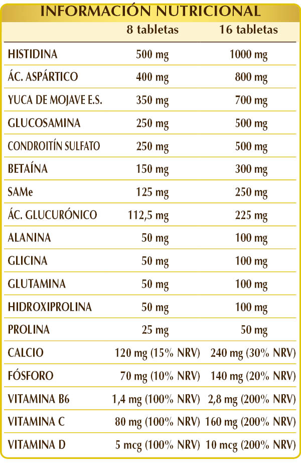 (L-)histidina, sulfato de D-glucosamina (proveniente de fermentación), ácido (L-)aspártico, fosfato cálcico dibásico, yuca (Yucca schidigera) hierba E.S. (estandarizado al 60 % en saponinas), celulosa microcristalina°, goma arábiga°, sulfato de condroitina (de bovino), SAMe (S-adenosil metionina disulfato tosilato), betaína, dióxido de silicio°°, glucuronato de sodio, vitamina C (ácido ascórbico), carbonato de calcio, estearato de magnesio de origen vegetal°°, (L-)alanina, glicina, (L-)glutamina, (L-)hidroxiprolina, (L-)prolina, vitamina B6 activada (piridoxal-5-fosfato), líquen (Cladonia rangiferina) talo E.S. (estandarizado en vitamina D3 colecalciferol 100 000 UI/g), selenito de sodio, biotina. °Agente de carga.