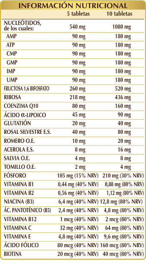 Mezcla de nucleótidos: AMP (monofosfato de adenosina), ATP (trifosfato de adenosina), CMP (monofosfato de citosina), GMP (monofosfato de guanosina), IMP (monofosfato de inosina), UMP (monofosfato de uridina); fructosa 1,6 bifosfato, celulosa microcristalina°, goma arábiga°, ribosa, coenzima Q10, ácido α-lipoico, rosal silvestre (Rosa canina) frutos E.S (titulado al 70 % en vitamina C), glutatión, dióxido de silicio°°, estearato de magnesio de origen vegetal°°, vitamina E de origen vegetal (acetato de D-α-tocoferol), romero (Rosmarinus officinalis) sumidades floridas A.E., sorbitol, acerola (Malpighia glabra) frutos E.S., (titulado al 50 % en vitamina C), vitamina B3 (nicotinamida), salvia (Salvia officinalis) hojas A.E., vitamina B5 (pantotenato de calcio), tomillo común (Thymus vulgaris) hojas A.E., vitamina B2 (riboflavina), vitamina B6 (clorhidrato de piridoxina), vitamina B1 (clorhidrato de tiamina), ácido fólico, biotina, vitamina B12 (cianocobalamina).