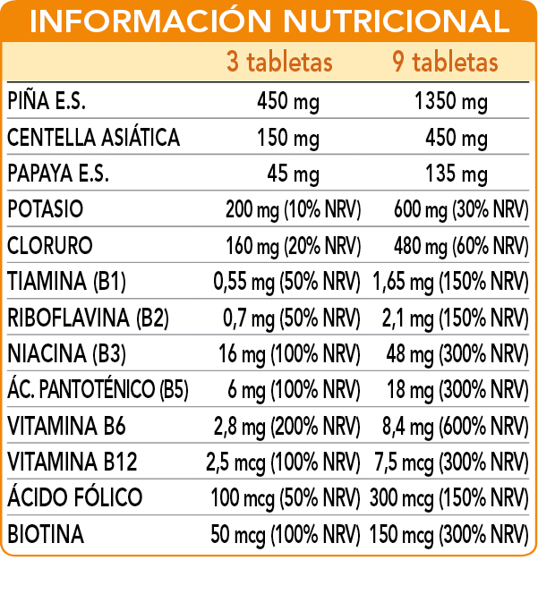 La piña y la centella asiática son útiles para combatir la piel de naranja causada por la celulitis. Además, la piña favorece el drenaje de los líquidos corporales y, junto a la centella asiática, promueve el buen funcionamiento de la microcirculación aliviando la sensación de pesadez en las piernas. Las vitaminas B1, B3, B5, B6 y B12 y la biotina estimulan el metabolismo energético.