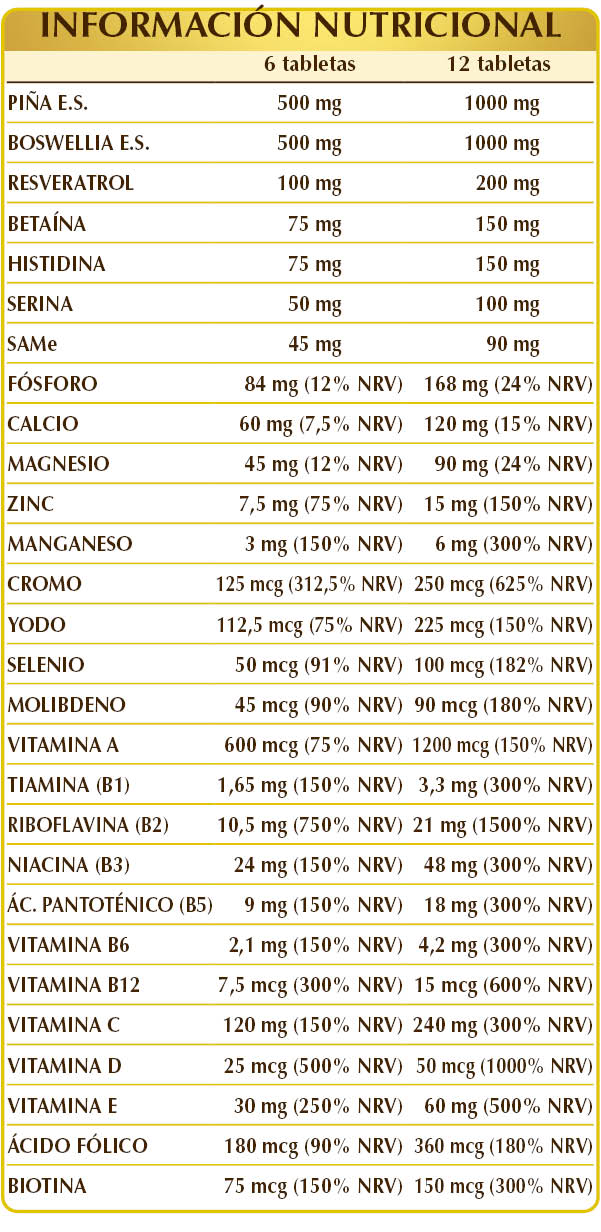 Piña (Ananas comosus) tallos de los frutos E.S. (bromelina 2500 GDU/g), boswellia (Boswellia serrata) goma-resina E.S. (estandarizado al 65% en ácidos boswélicos), celulosa microcristalina°, goma arábiga°, fosfato cálcico básico, glicerofosfato de magnesio, vitamina C (ácido ascórbico), resveratrol de origen vegetal, SAMe (S-adenosil metionina disulfato tosilato), betaína, (L-)histidina, vitamina E de origen vegetal (acetato de D-α-tocoferilo), dióxido de silicio°°, gluconato de zinc, (L-)serina, óxido de magnesio, gluconato de manganeso, vitamina B3 (nicotinamida), estearato de magnesio de origen vegetal°°, vitamina B2 activada (riboflavina 5-fosfato de sodio), liquen (Cladonia rangiferina) talo E.S. (estandarizado en vitamina D3 colecalciferol 100.000 UI/g), vitamina B5 (pantotenato de calcio), vitamina A (acetato de retinilo), vitamina B6 activada (piridoxal-5-fosfato), vitamina B1 (clorhidrato de tiamina), picolinato de cromo, ácido fólico activado (L-metilfolato de calcio), yoduro de potasio, molibdato de sodio, seleniato de sodio, biotina, vitamina B12 activada (5-desoxiadenosilcobalamina, metilcobalamina).