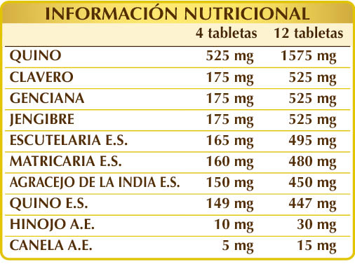 Quino (Cinchona calisaya) corteza en polvo, claveros (Eugenia caryophyllata) yemas florales en polvo, genciana (Gentiana lutea) raíces en polvo, jengibre (Zingiber officinalis) rizomas en polvo, escutelaria (Scutellaria baicalensis) raíces E.S. (titulado al 95% en baicalina), feverfew o crisantemo partenio (Tanacetum parthenium) cálices (flores) E.S. (titulado al 0,8 % en partenolida), agracejo de la India (Berberis aristata) cortezas de las ramas E.S. (titulado al 97% en berberina), quino (Cinchona calisaya) cortezas E.S. (titulado al 99% en sulfato de quinina), celulosa microcristalina°, goma arábiga°, silicio biossido°°, hinojo (Foeniculum vulgare) frutos A.E., magnesio stearato de origin vegetal°°, canela (Cinnamomum zeylanicum) cortezas A.E.