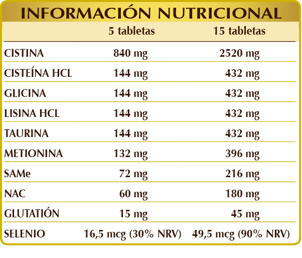 (L-)cistina, celulosa microcristalina°, goma arábiga°, (L-)cisteína HCL o clorhidrato, glicina, (L-)lisina HCL o clorhidrato, SAMe (S-adenosil metionina tosilato de disulfato), taurina, (L-)metionina, NAC (N-acetilcisteína), dióxido de silicio°°, glutatión reducido, estearato de magnesio de origen vegetal°°, (L-)seleniometionina.