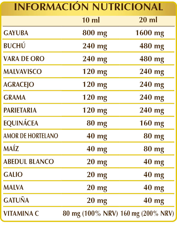 La gayuba, el buchú, la vara de oro, la grama, la parietaria, el amor de hortelano, el maíz, el abedul blanco y el galio favorecen el drenaje de los líquidos corporales y la buena salud del as vías urinarias. El malvavisco, la malva y la gatuña ejercen una acción emoliente y lenitiva en el aparato urinario, mientras que la equinácea y la vitamina C refuerzan las defensas naturales del organismo.