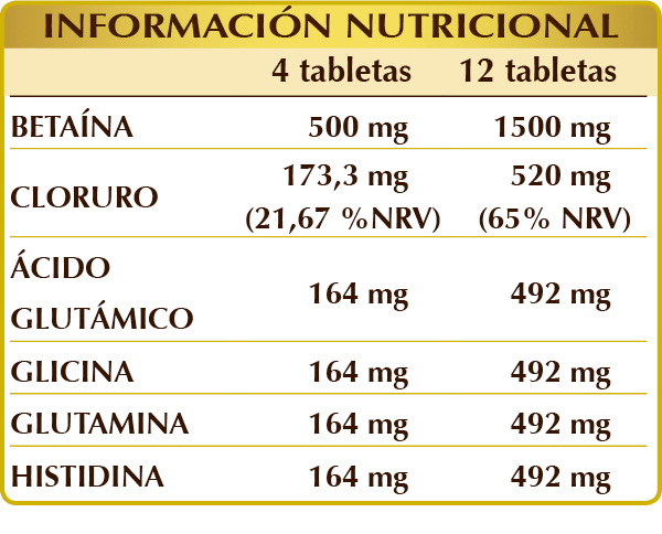 Complemento alimenticio de cloruro enriquecido con clorhidrato de betaína y otros nutrientes. El cloruro estimula la función digestiva mediante la adecuada producción de ácido clorhídrico en el estómago, mientras que la betaína contribuye al metabolismo normal de la homocisteína*.