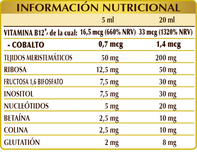 *Cianocobalamina: contiene cobalto en forma orgánica. NRV = Valor Nutricional de Referencia.