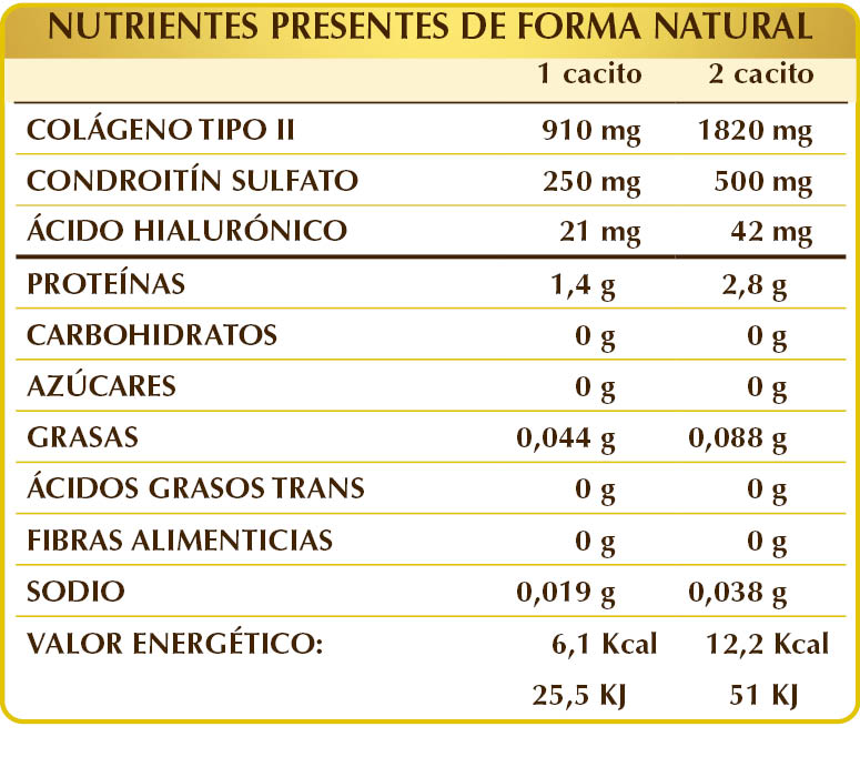 Colágeno tipo II de cartílago de pollo hidrolizado en polvo (52%), maltodextrinas de maíz o arroz.