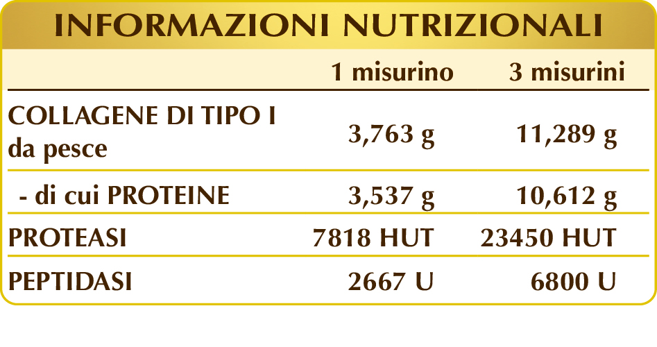 Colágeno tipo I de gelatina de pescado hidrolizada en gránulos, enzimas digestivas de origen vegetal (de Aspergillus spp): proteasa (500.000 HUT/g) y peptidasa (200.000 U/g).