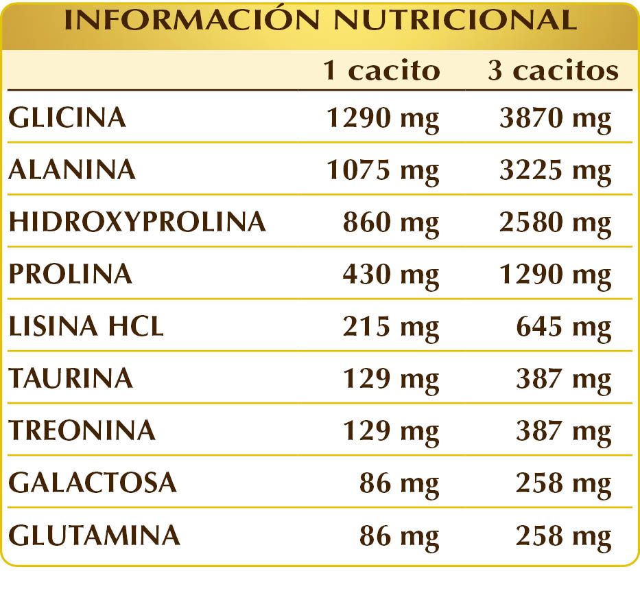 Glicina, (L-)alanina, (L-)hidroxiprolina, (L-)prolina, (L-)lisina HCL o clorhidrato, taurina, (L-)treonina, (D-)galactosa de origen vegetal, (L-)glutamina.