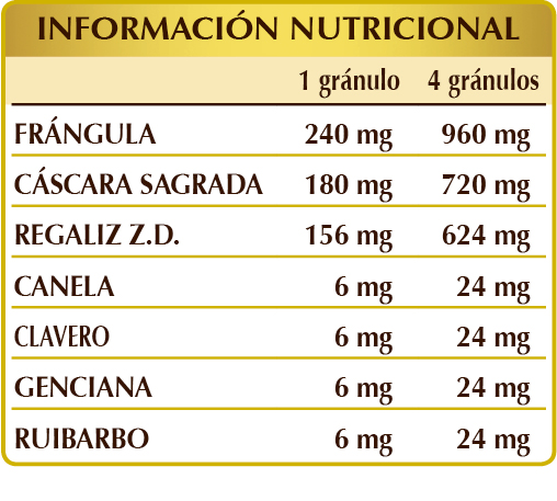 La frángula, la cáscara sagrada y el ruibarbo chino favorecen la regularidad del tránsito intestinal. La genciana, la canela y el clavero promueven la eliminación de los gases intestinales y, junto con el regaliz, son útiles para ayudar a la función digestiva.
