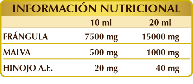 Frángula (Rhamnus frangula) cortezas E.I.L., malva (Malva sylvestris) hojas E.I.L., glicerina vegetal bidestilada, agua pura, hinojo (Foeniculum vulgare) frutos A.E.; edulcorantes de origen natural: glucósidos de esteviol,.