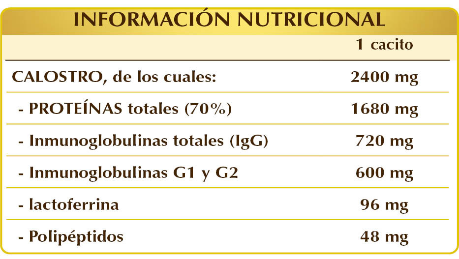 Calostro procedente de leche de vaca desnatada, pasteurizada y liofilizada (inmunoglobulinas tot. IgG 30 % mínimo) en polvo.