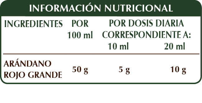Extracto integral líquido sin alcohol obtenido a partir de: glicerina vegetal bidestilada, agua pura, arándano rojo grande o arándano rojo americano (Vaccinium macrocarpon) frutos.