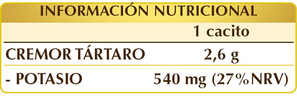 Como levadura, solo hay que sustituir la cantidad de levadura requerida para la preparación por mitad de cremor tártaro y mitad de bicarbonato de sodio o de potasio. Como bebida, disolver un cacito en una taza de agua hirviendo, dejándola atemperar antes de beberla. Si se enfría la solución, el crémor tártaro se separa del agua en cristales, que pueden disolverse nuevamente con agua hirviendo. Cacito dosificador incluido en el envase.
