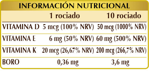 Complemento alimenticio en spray de vitamina D con vitaminas E y K y boro. La vitamina D ayuda a absorber el calcio y el fósforo, a mejorar la función muscular y a mantener los dientes sanos, estimula el proceso de división celular y contribuye al correcto funcionamiento del sistema inmunitario. Junto a la vitamina K, favorece el mantenimiento de la buena salud de los huesos. Por su parte, la vitamina K mejora la coagulación de la sangre, mientras que la vitamina E ayuda a proteger las células contra el estrés oxidativo.