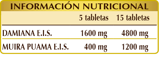 Damiana (Turnera diffusa) hojas E.I.S., muira puama (Ptychopetalum olacoides) madera E.I.S., goma arábiga°, celulosa microcristalina°, dióxido de silicio°°, estearato de magnesio de origen vegetal°°.