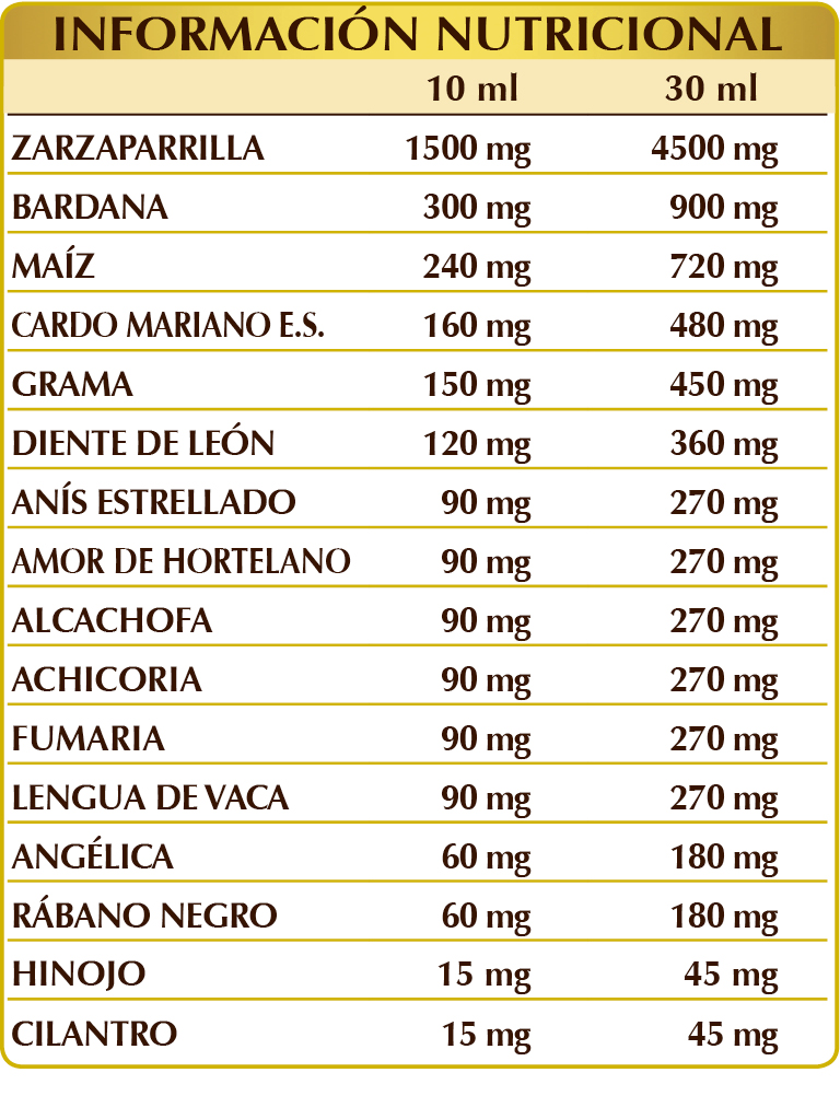 Glicerina vegetal bidestilada, agua pura, zarzaparrilla (Smilax medica) raíces E.I.L., bardana (Arctium lappa) hierba y raíces frescas E.I.L., maíz (Zea mays) estigmas E.I.L., cardo mariano (Silybum marianum) frutos E.S. (estandarizado al 40 % en silimarina), grama (Agropyron repens) rizomas E.I.L., diente de león (Taraxacum officinale) raíces E.I.L., anís estrellado (Illicium verum) frutos E.I.L., amor de hortelano (Galium aparine) hierba con flores E.I.L., alcachofa (Cynara scolymus) hojas E.I.L., achicoria (Cichorium intybus) raíces E.I.L., fumaria (Fumaria officinalis) hierba con flores E.I.L., lengua de vaca (Rumex crispus) raíces E.I.L., angélica (Angelica archangelica) raíces E.I.L., rábano negro (Raphanus sativus var. niger) raíces E.I.L., hinojo (Foeniculum vulgare) frutos E.I.L., cilantro (Coriandrum sativum) frutos E.I.L.; edulcorantes de origen natural: glucósidos de esteviol, taumatina.