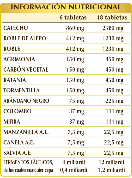 Catechu (Acacia catechu) goma en polvo, nuez de galla (Quercus infectoria) agallas en polvo, roble (Quercus robur) corteza en polvo, celulosa microcristalina°, goma arábiga°, agrimonia (Agrimonia eupatoria) hierba en polvo, carbón vegetal puro (Carbo vegetabilis) de madera en polvo, ratania (Krameria triandra) raíces en polvo, tormentilla (Potentilla erecta) rizomas en polvo, arándano negro (Vaccinium myrtillus) frutos en polvo, dióxido de silicio°°, colombo (Jateorhiza palmata) raíces en polvo, mirra (Commiphora myrrha) goma-resina en polvo, mezcla de fermentos lácticos (estandarizada al 10% en cada una de las siguientes cepas: Bifidobacterium bifidum SD5215, breve SD5206, lactis SD5219; Lactobacillus acidophilus SD5212, brevis SD5214, bulgaricus SD5589, casei SD5213, paracasei SD5275, plantarum SD5209, rhamnosus SD5217), manzanilla romana (Anthemis nobilis) capítulos florales O.E., canela (Cinnamomum zeylanicum) corteza O.E., salvia (Salvia officinalis) hojas A.E., estearato de magnesio de origen vegetal°°. Plv= Polvo °Agente de carga. °°Antiaglomerante