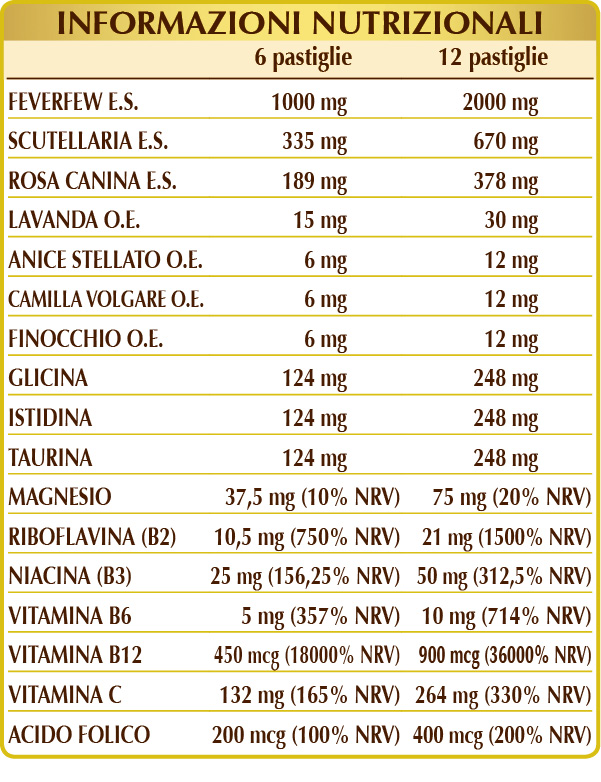 Feverfew o crisantemo partenio (Tanacetum parthenium) cálices (flores) E.S. (titulado al 0,8 % en partenólido), escutelaria (Scutellaria baicalensis) raíces E.S. (titulado al 30% en baicalina), glicerofosfato de magnesio, celulosa microcristalina°, goma arábiga°, rosal silvestre (Rosa canina) frutos E.S. (titulado al 70 % en vitamina C), glicina, (L-)histidina, taurina, dióxido de silicio°°, vitamina B3 (inositol hexanicotinato), estearato de magnesio de origen vegetal°°, vitamina B2 activada (hexanicotinato de inositol), óxido de magnesio, lavanda (Lavandula officinalis) sumidades floridas A.E., vitamina B6 activada (piridoxal-5-fosfato), anís estrellado (Illicium verum) frutos A.E., manzanilla vulgar (Matricaria chamomilla) cálices (flores) A.E., hinojo (Foeniculum vulgare) frutos A.E., vitamina B12 activada (metilcobalamina, 5-desoxiadenosilcobalamina), ácido fólico activado (L-metilfolato de calcio). °Agente de carga °°Antiaglomerante