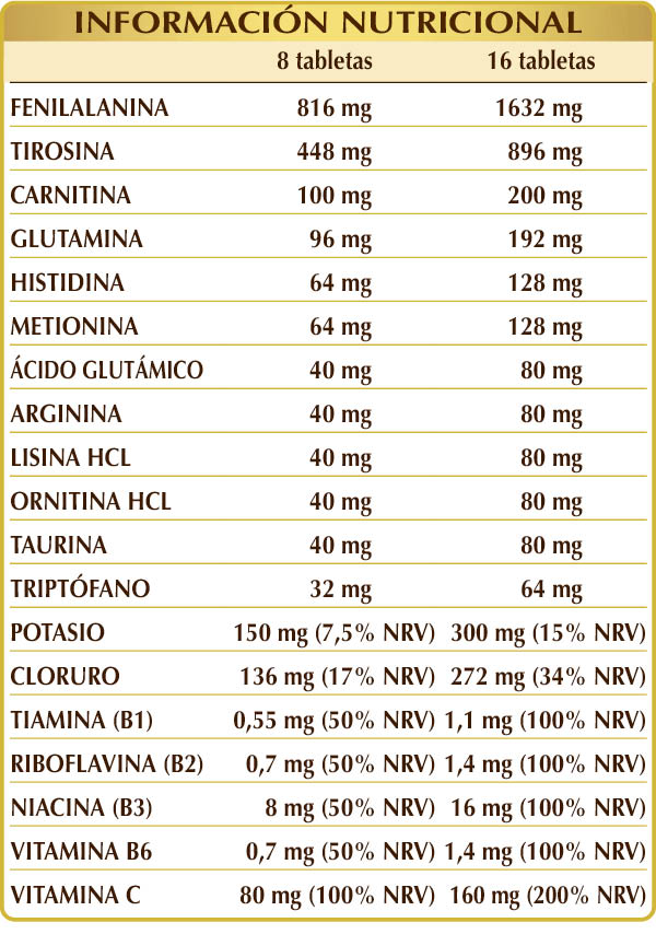 (DL-)fenilalanina, (L-)tirosina, celulosa microcristalina°, goma arábiga°, cloruro de potasio, (L-)carnitina tartrato, dióxido de silicio°°, (L-)glutamina, vitamina C (ácido ascórbico), (L-)metionina, (L-)histidina, ácido (L-)glutámico, (L-)arginina, (L-)lisina HCL o clorhidrato, (L-)ornitina HCL o clorhidrato, taurina, (L-)triptófano, estearato de magnesio vegetal°°, vitamina B3 (niacina), vitamina B6 (clorhidrato de piridoxina), vitamina B2 (riboflavina), vitamina B1 (clorhidrato de tiamina).