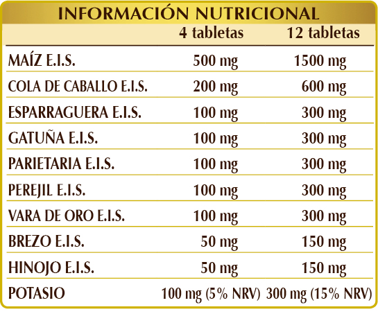 Maíz (Zea mays) estigmas E.I.S., citrato de potasio, celulosa microcristalina°, goma arábiga°, cola de caballo (Equisetum arvense) hierba E.I.S., esparraguera (Asparagus officinalis) raíces E.I.S., gatuña (Ononis spinosa) raíces E.I.S., parietaria (Parietaria officinalis) hierba E.I.S., perejil (Petroselinum crispum) raíces E.I.S., vara de oro (Solidago virga-aurea) hierba con flores E.I.S., brezo (Calluna vulgaris) hierba con flores E.I.S., hinojo (Foeniculum vulgare) frutos E.I.S., dióxido de silicio°°, estearato de magnesio de origen vegetal°°. °Agente de carga °°Antiaglomerante