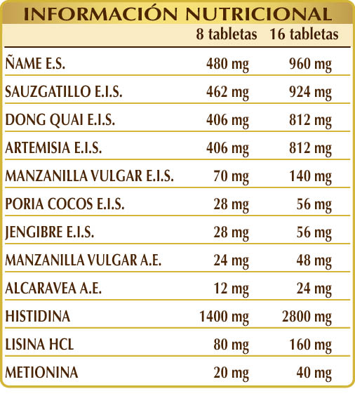 (L-)histidina, ñame (Dioscorea opposita) raíces E.S. (titulado al 16 % en diosgenina), sauzgatillo (Vitex agnus castus) frutos E.I.S., dong quai (Angelica sinensis) raíces E.I.S., artemisa (Artemisia vulgaris) hierba con flores E.I.S., celulosa microcristalina°, goma arábiga°, (L-)lisina HCL o clorhidrato, manzanilla vulgar (Matricaria chamomilla) cálices (flores) E.I.S., dióxido de silicio°°, estearato de magnesio de origen vegetal°°, poria cocos (Poria cocos) esclerocio (hongo) E.I.S., jengibre (Zingiber officinalis) rizomas E.I.S., manzanilla vulgar (Matricaria chamomilla) cálices (flores) A.E., (L-)metionina, alcaravea (Carum carvi) frutos A.E.