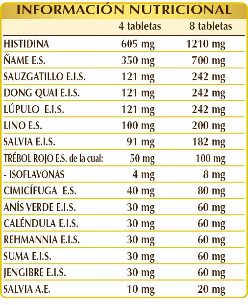 (L-)histidina, ñame (Dioscorea opposita) raíces E.S. (titulado al 16 % en diosgenina), sauzgatillo (Vitex agnus castus) frutos E.I.S., dong quai (Angelica sinensis) raíces E.I.S., lúpulo (Humulus lupulus) estróbilos (flores hembra) E.I.S., celulosa microcristalina°, lino (Linum usitatissimum) semillas E.S. (titulado al 20% en secoisolaricirresinol diglucósido), salvia (Salvia officinalis) hojas E.I.S., goma arábiga°, dióxido de silicio°°, trébol rojo (Trifolium pratense) flores E.S. (titulado al 8 % en isoflavonas), cimicífuga (Cimicifuga racemosa) rizomas E.S. (titulado al 2,5 % en glicósidos triterpénicos), anís verde (Pimpinella anisum) frutos E.I.S., caléndula (Calendula officinalis) cálices (flores) E.I.S., rehmannia (Rehmannia glutinosa) raíces E.I.S., suma o ginseng de Brasil (Pfaffia paniculata) raíces E.I.S., jengibre (Zingiber officinalis) rizomas E.I.S., estearato de magnesio de origen vegetal°°, salvia (Salvia officinalis) hojas A.E.