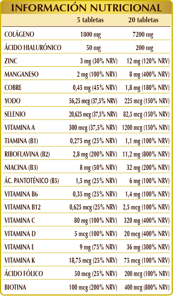Colágeno bovino hidrolizado, celulosa microcristalina°, goma arábiga°, vitamina C (ácido ascórbico), hialuronato de sodio, dióxido de silicio°°, gluconato de zinc, gluconato de manganeso, vitamina E de origen vegetal (D-α-tocoferilo acetato), estearato de magnesio de origen vegetal°°, vitamina B2 activada (riboflavina 5-fosfato de sodio), vitamina B3 (nicotinamida), gluconato de cobre, liquen (Cladonia rangiferina) talo D.E. (estandarizado en vitamina D3 colecalciferol 100 000 UI/g), vitamina A (acetato de retinilo), vitamina B5 (pantotenato de calcio), vitamina B6 activada (piridoxal-5-fosfato), vitamina B1 (clorhidrato de tiamina), biotina, yoduro de potasio, ácido fólico activado (L-metilfolato de calcio), selenito de sodio, vitamina K1 (filoquinona), vitamina B12 activada (5-deoxiadenosilcobalamina, metilcobalamina). E.S. = Extracto Seco °Agente de carga. °°Antiaglomerante