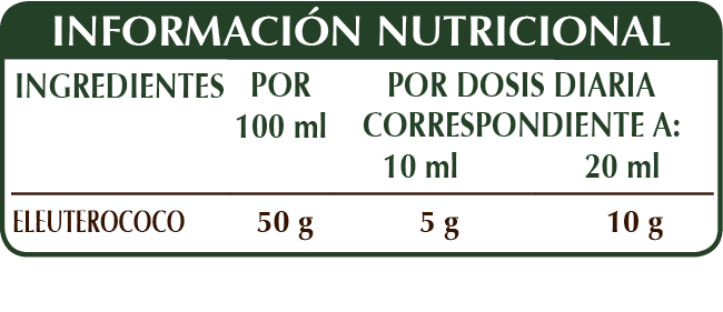 Extracto integral líquido sin alcohol obtenido a partir de: glicerina vegetal bidestilada, agua pura, eleuterococo o ginseng siberiano (Eleutherococcus senticosus) raíces.