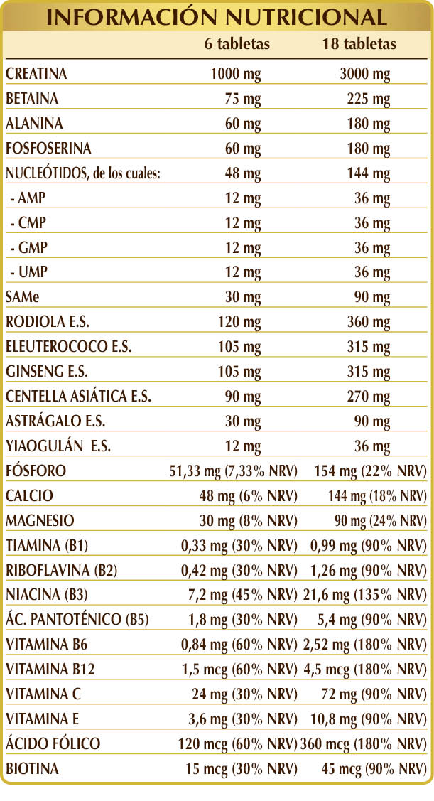 Monohidrato de creatina, celulosa microcristalina°, goma arábiga°, fosfato cálcico dibásico, rodiola (Rhodiola rosea) raíces E.S. (titulado al 3 % en salidrósidos), eleuterococo (Eleutherococcus senticosus) raíces E.S. (titulado al 0,8 % en eleuterósidos), ginseng (Panax ginseng) raíces E.S. (titulado al 20% en ginsenósidos), centella asiática (Centella asiatica) hierba E.S. (titulado al 20 % en derivados triterpénicos), betaína, citrato de creatina, fosfato de creatina, (DL-)alanina, SAMe (S-adenosil metionina tosilato de disulfato), gelatina alimentaria, dióxido de silicio°°; mezcla de nucleótidos: AMP (monofosfato de adenosina), CMP (monofosfato de citosina), GMP (monofosfato de guanosina), UMP (monofosfato de uridina); óxido de magnesio, astrágalo (Astragalus membranaceus) raíces E.S. (titulado al 70 % en polisacáridos), glicerofosfato de magnesio, vitamina C (ácido ascórbico), estearato de magnesio de origen vegetal°°, yiaogulán (Gynostemma pentaphyllum) hierba E.S. (titulado al 80 % en gipenósidos), vitamina E de origen vegetal (acetato de D-α-tocoferol), vitamina B3 activada (nicotinamida), vitamina B5 (pantotenato de calcio), vitamina B6 activada (piridoxal-5-fosfato), vitamina B2 activada (riboflavina 5-fosfato de sodio), vitamina B1 (clorhidrato de tiamina), ácido fólico activado (L-metilfolato de calcio), biotina, vitamina B12 activada (5-desoxiadenosilcobalamina, metilcobalamina). °Agente de carga. °°Antiaglomerante