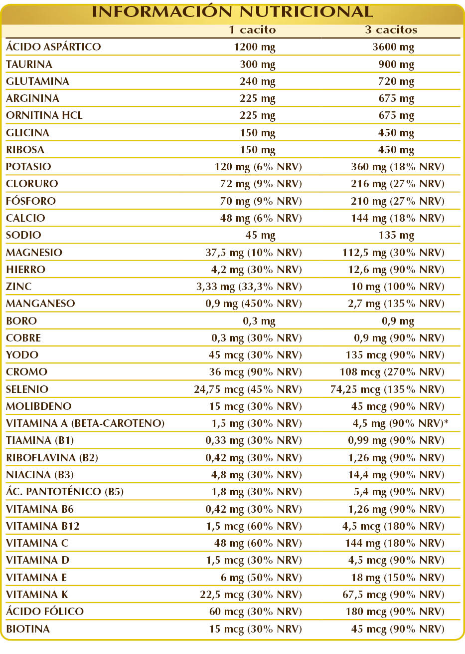 Maltodextrinas de maíz o arroz, ácido (L-)aspártico, limón (Citrus limon) frutos S.D., taurina, glicerofosfato de calcio, (L-)glutamina, glicerofosfato de magnesio, (L-)arginina, (L-)ornitina HCL o clorhidrato, citrato de sodio, cloruro de potasio; corrector de acidez: ácido cítrico; glicina, glucosa (dextrosa), ribosa, citrato de potasio, citrato básico de magnesio, vitamina C (ácido ascórbico), citrato férrico de amonio, gluconato de zinc, beta-caroteno (estandarizado al 10%), vitamina E (acetato de DL-α-tocoferilo), gluconato de manganeso; edulcorantes de origen natural: glucósidos de esteviol de stevia, taumatina; vitamina B3 (nicotinamida), borato de sodio, vitamina B5 (pantotenato de calcio), sulfato de cobre, vitamina B2 activada (riboflavina 5-fosfato de sodio), vitamina B6 activada (piridoxal-5-fosfato), vitamina D3 (colecalciferol 100.000 UI/g), vitamina B1 (clorhidrato de tiamina), picolinato de cromo, ácido fólico activado (L-metilfolato de calcio), yoduro de potasio, seleniato de sodio, molibdato de sodio, vitamina K1 (filoquinona), biotina, vitamina B12 activada (5-desoxiadenosilcobalamina, meticobalamina).