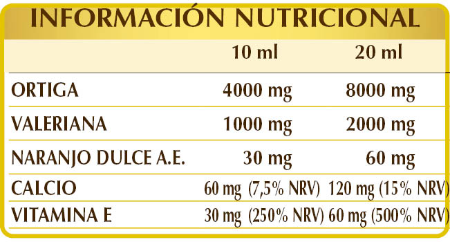 Glicerina vegetal bidestilada, agua pura, ortiga (Urtica dioica) sumidades E.I.L., valeriana (Valeriana officinalis) raíces E.I.L., lactato cálcico, vitamina E (acetato de DL-α-tocoferol); aroma natural: naranjo dulce (Citrus aurantium var. sinensis o dulcis) cáscaras de los frutos A.E; edulcorantes de origen natural: glucósidos de esteviol y taumatina.