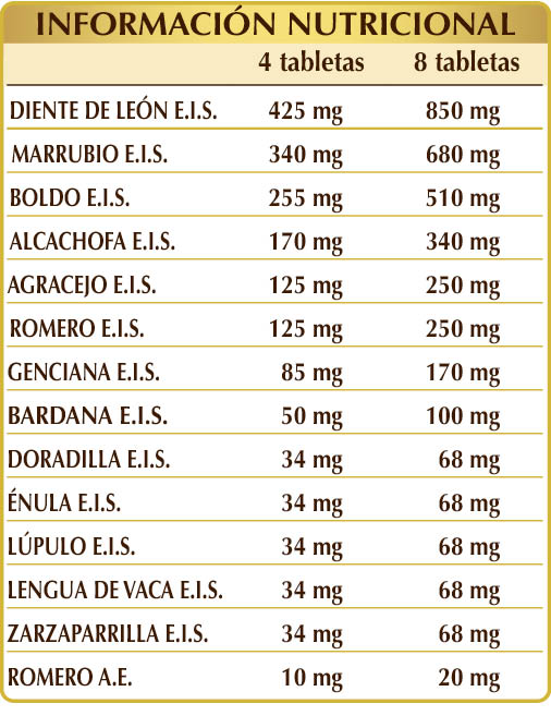 El diente de león, el boldo, la alcachofa, el agracejo, el romero y la genciana ayudan a mantener una adecuada función hepática. El marrubio, la énula y el lúpulo mejoran la función digestiva, mientras que la lengua de vaca, la zarzaparrilla y la bardana estimulan la función depurativa del organismo.