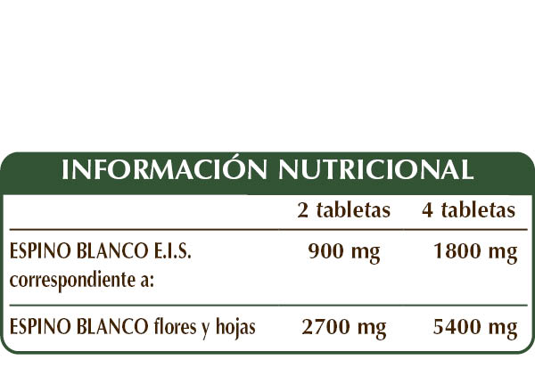 Espino blanco (Crataegus oxyacantha) flores y hojas E.I.S., celulosa microcristalina°, goma arábiga°, dióxido de silicio°°, estearato de magnesio de origen vegetal°°.